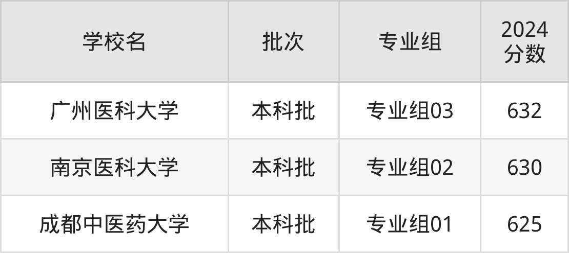 考生能上的有3所,全部在本科批次录取。具体有:广州医科大学专业组03(632分)、南京医科大学专业组02(630分)、成都中医药大学专业组01(625分)。
