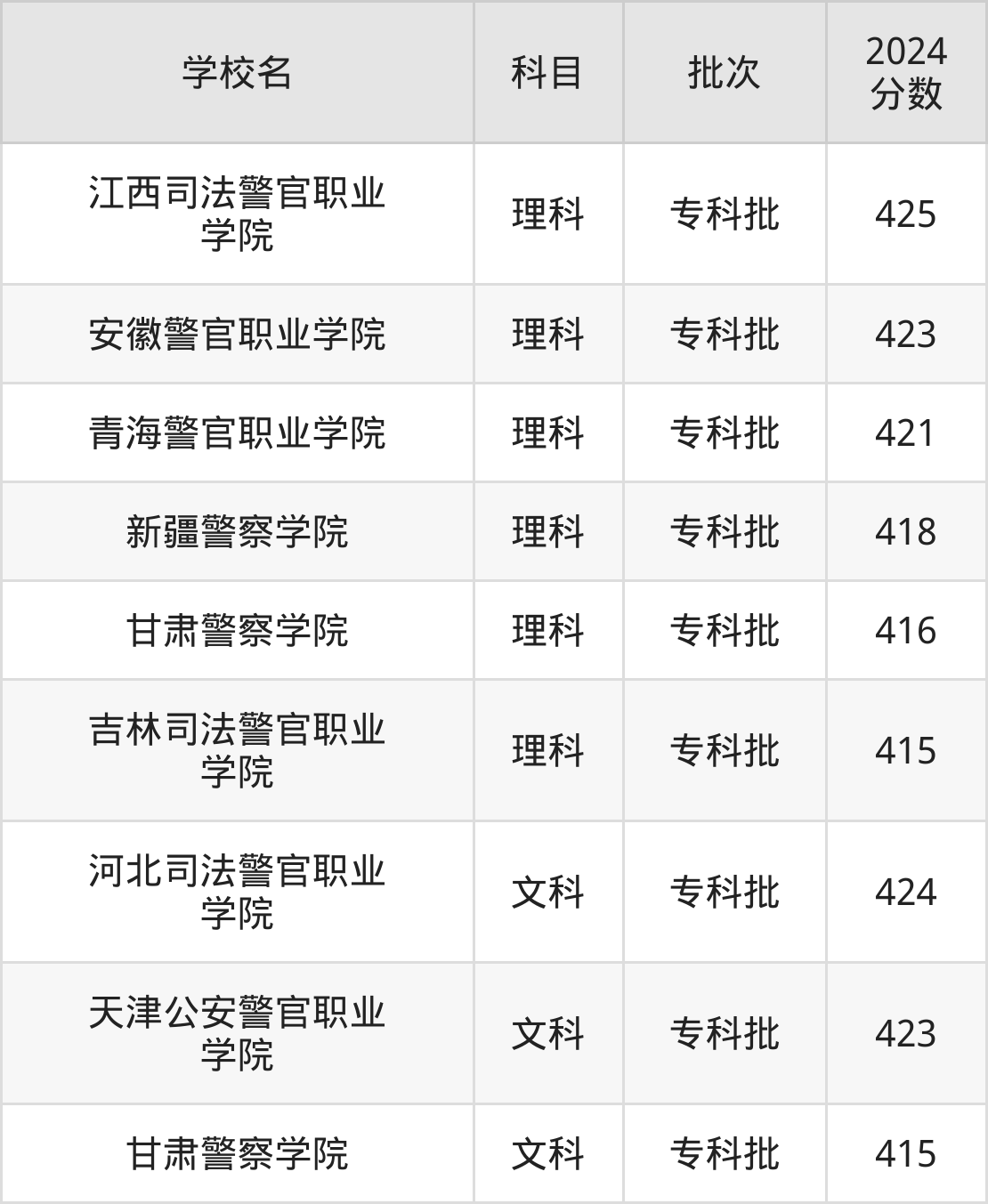 理科科目考生能上的有6所,包括2所本科医科大学和4所专科医科大学。具体有:江西司法警官职业学院(425分)、安徽警官职业学院(423分)、青海警官职业学院(421分)、新疆警察学院(418分)等;