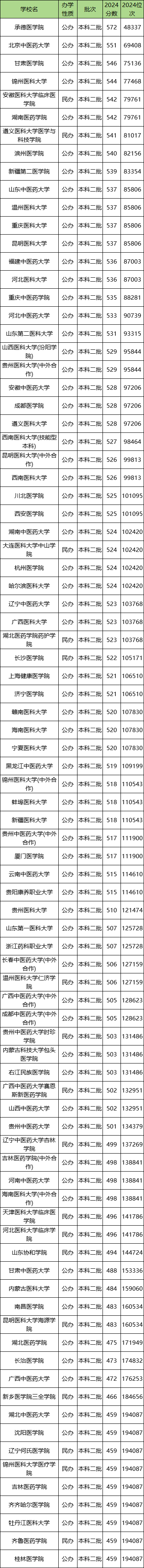 以四川理科为例,2024年全国二本医科大学录取分数线位于459分到572分之间,最难考的是承德医学院,学校2024年最低是572分,录取最低位次48337名。