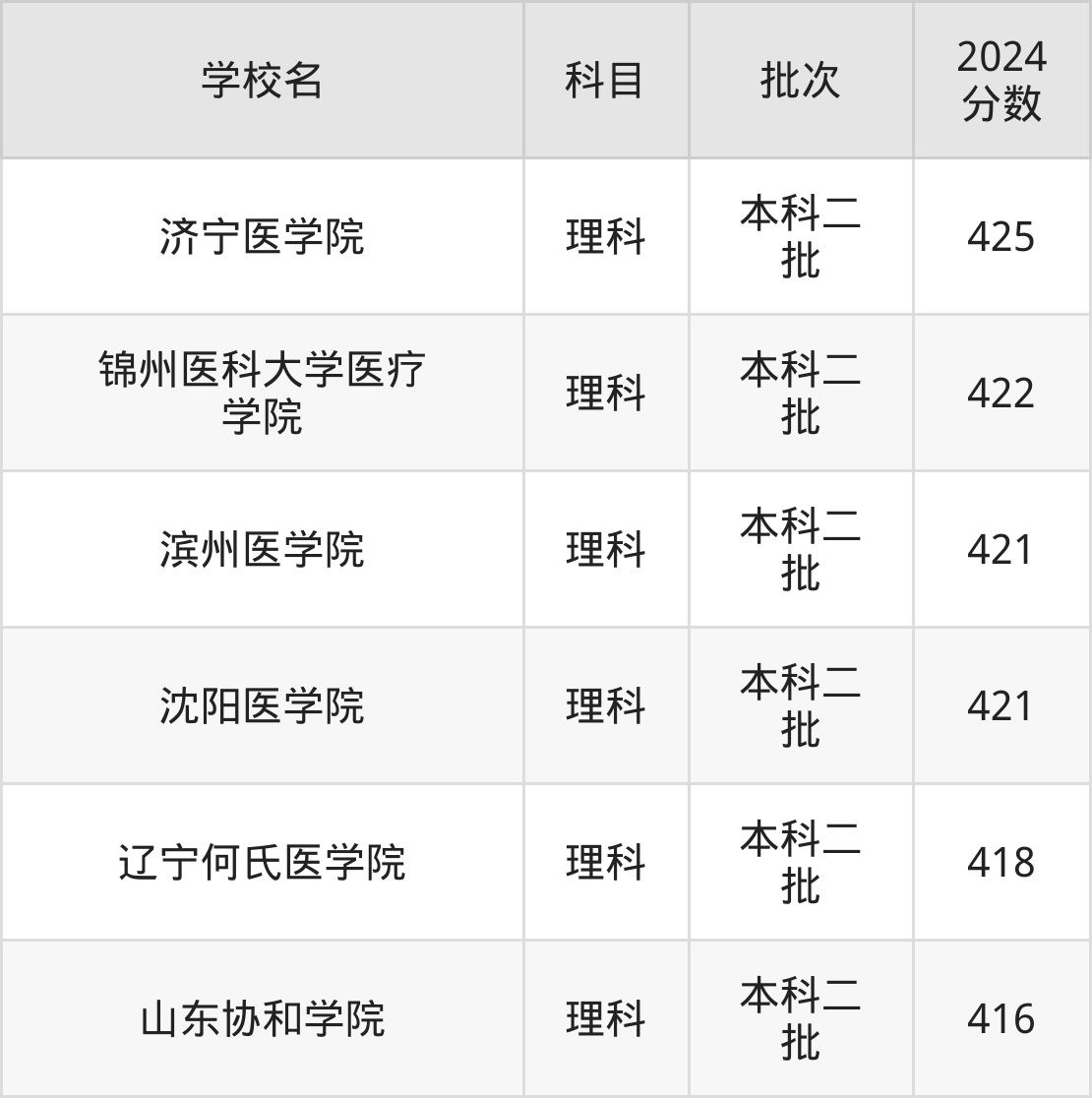 理科科目考生能上的有6所,全部在本科批次录取。具体有:济宁医学院(425分)、锦州医科大学医疗学院(422分)、滨州医学院(421分)、沈阳医学院(421分)等。