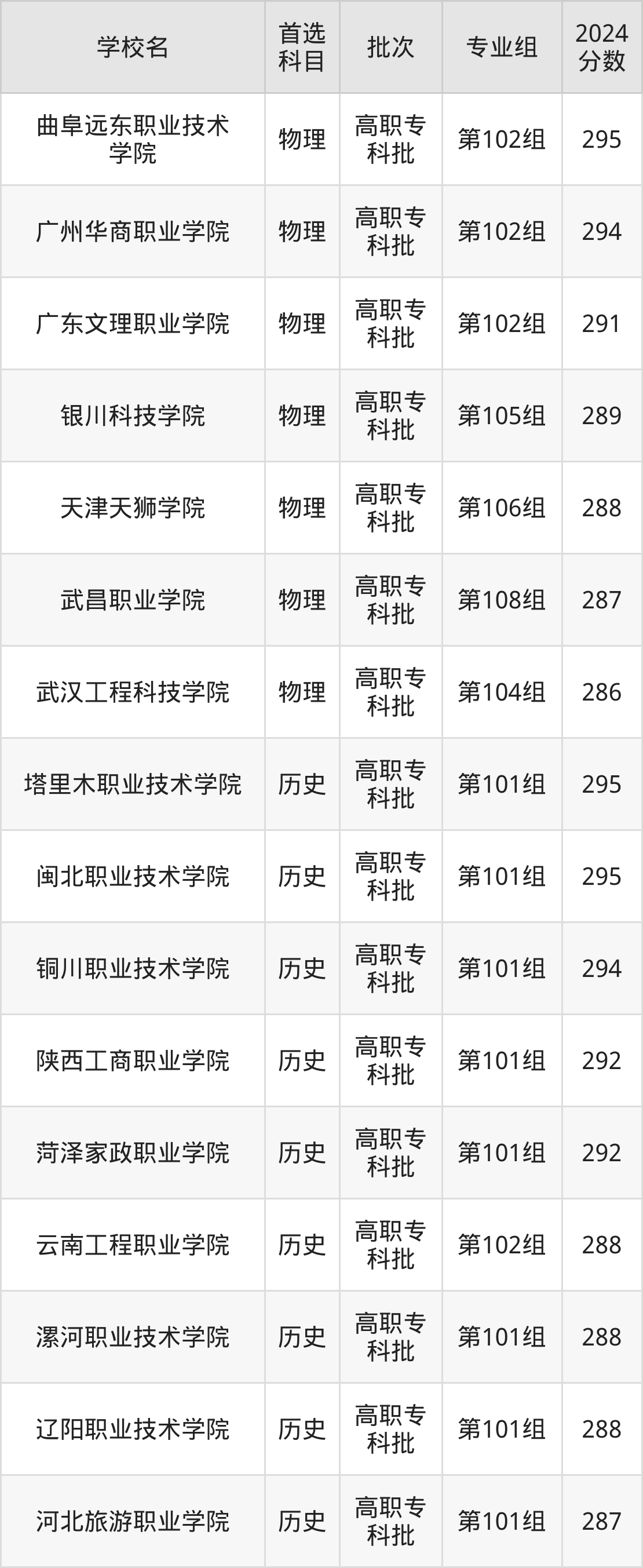 2、广东文理职业学院(2024年物理类第102组291分)