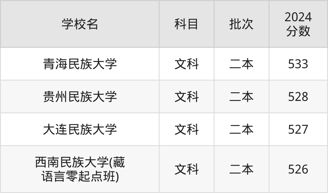 文科科目考生能上的有4所,全部在本科批次录取。具体有:青海民族大学(533分)、贵州民族大学(528分)、大连民族大学(527分)、西南民族大学(藏语言零起点班)(526分)等。
