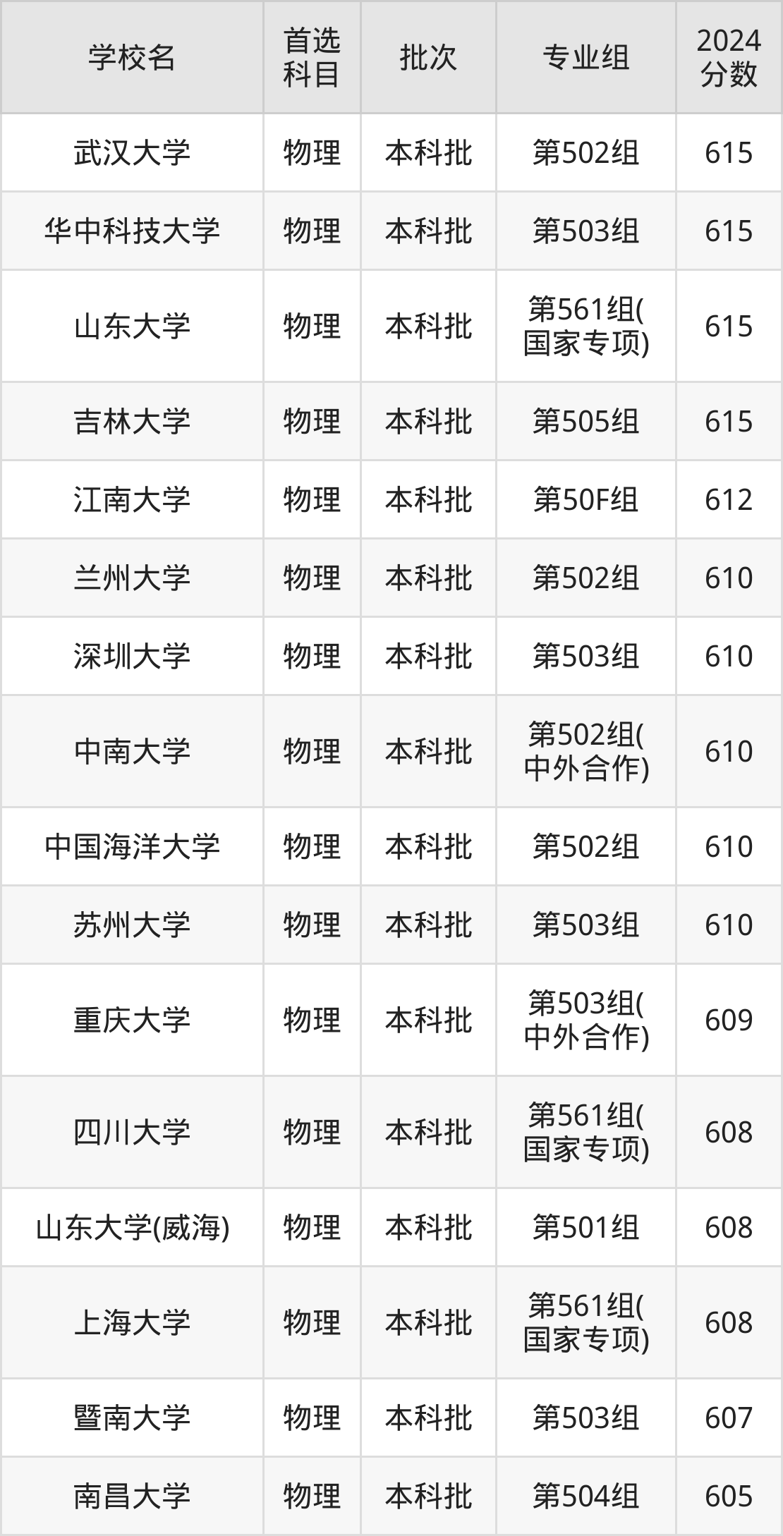 首选物理科目考生能上的有17所,全部在本科批次录取。具体有:武汉大学第502组(615分)、华中科技大学第503组(615分)、山东大学第561组(国家专项)(615分)、吉林大学第505组(615分)等;