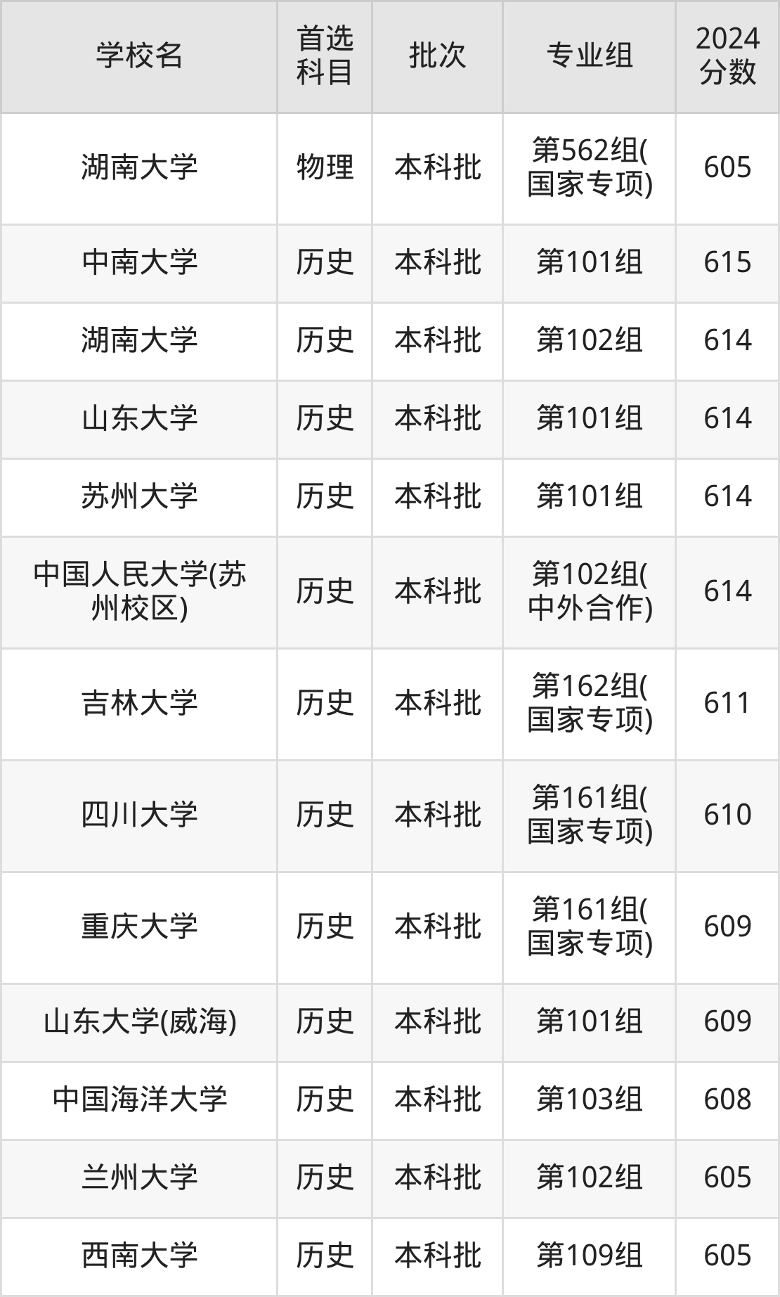 首选历史科目考生能上的有12所,全部在本科批次录取。具体有:中南大学第101组(615分)、湖南大学第102组(614分)、山东大学第101组(614分)、苏州大学第101组(614分)等。