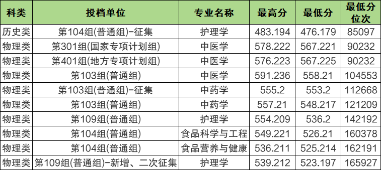 历史类最低476.179分、物理类523.197分,收分最低的专业为护理学。而录取最高分为物理类的591.236分,最高分专业对应的是中医学。
