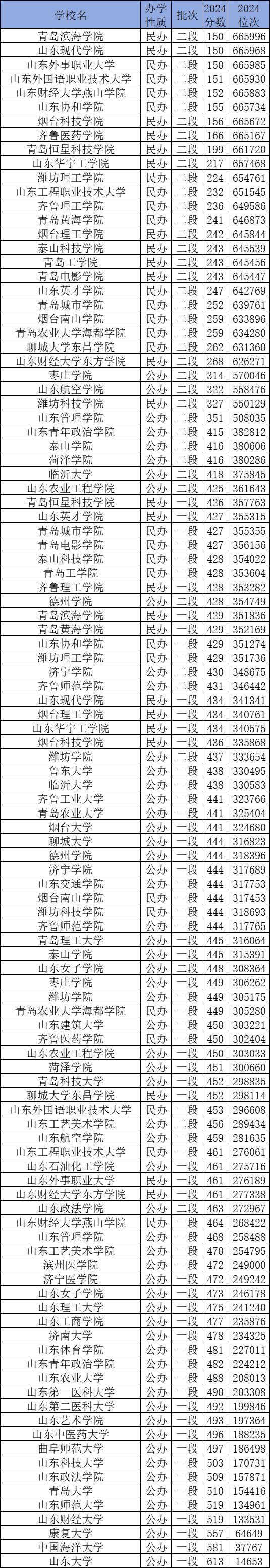 2024年山东各校录取分数线为:山东外国语职业技术大学151分、对应位次665930,山东财经大学燕山学院152分、对应位次665883等。详细分数线请看下文。
