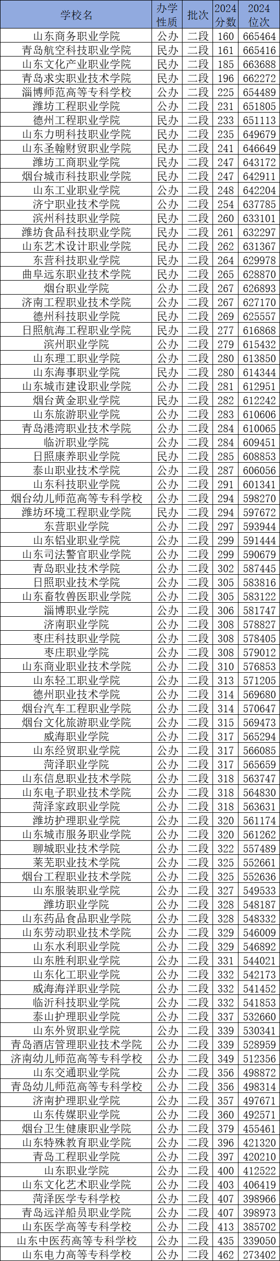 录取分数线最高、最难考的专科高校是山东电力高等专科学校,2024最低分数线为462分,位次为273402名。