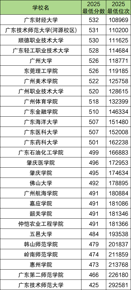 2025年广东物理组公办二本大学录取分数线位于425分到532分之间,对应位次排名从292581位到108969名。