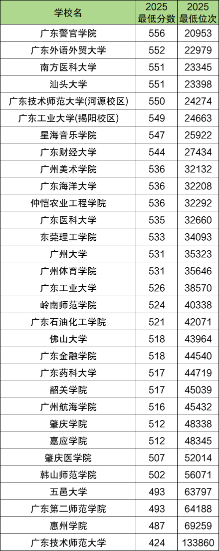 2025年广东历史组公办二本大学录取分数线位于424分到556分之间,对应位次排名从133860位到20953位。