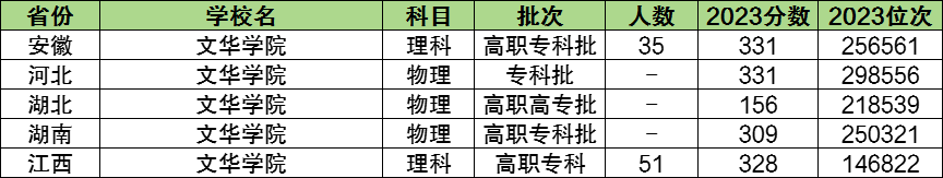 文华学院专科在湖北物理最低156分、安徽理科最低331分。本期将为大家整理2023年文华学院各省专科分数线,以及2024年在各省的招生计划人数。