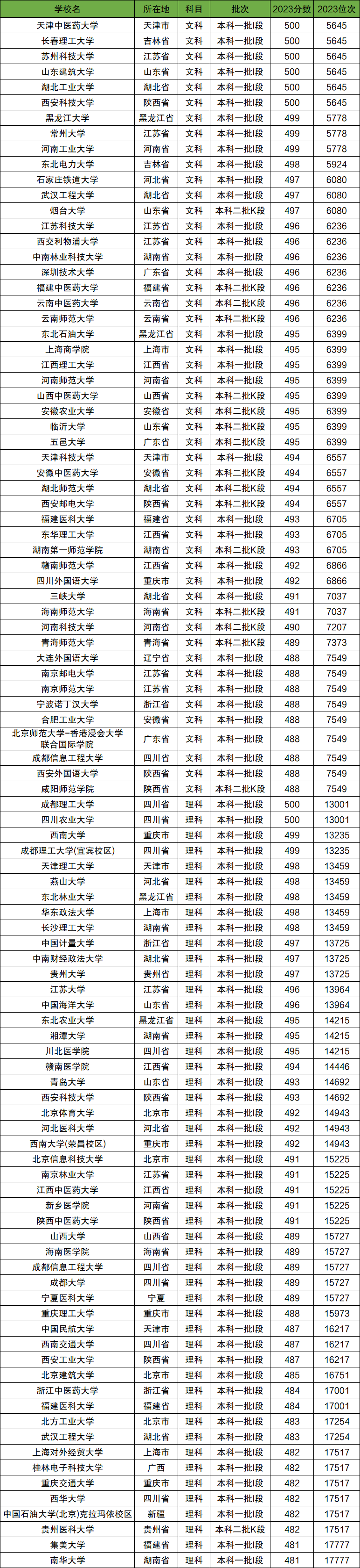 以下为2023年在甘肃省450到500分的全国大学名单(甘肃省以外)。