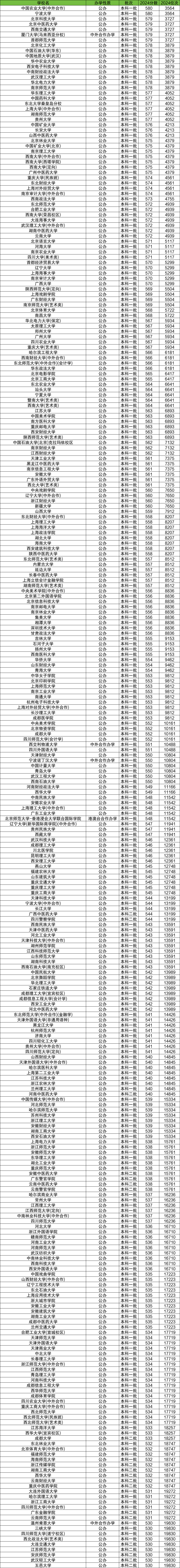 2024年文科录取分数线在530到580分能上的大学一共有295所,其中以一本大学居多。