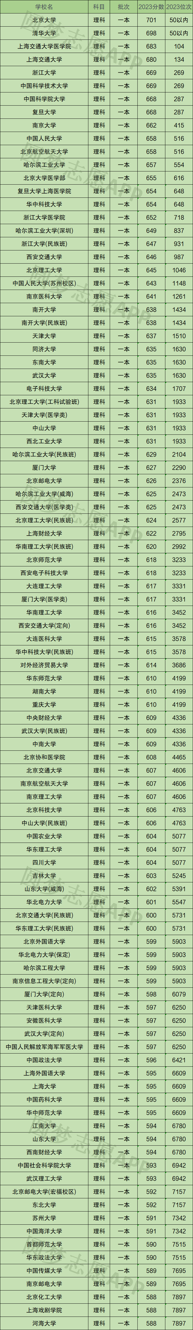 在全国本科大学中,理科考生里分数最高、最难考的是北京大学,最低录取分数是701分,所在的位次是50以内。
