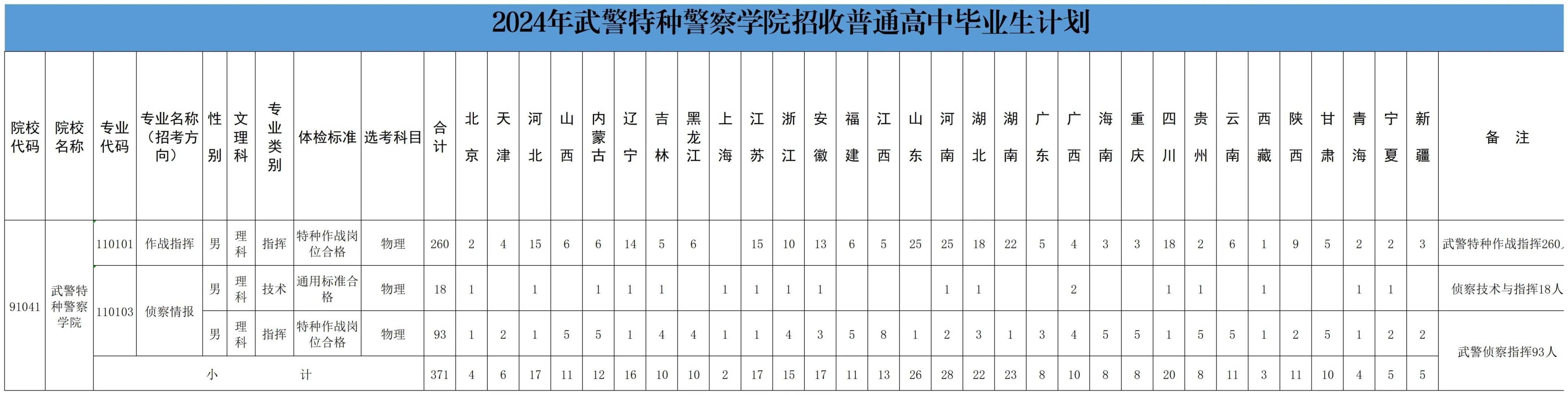 武警特种警察学院2024年分省、分专业招生计划数如下: