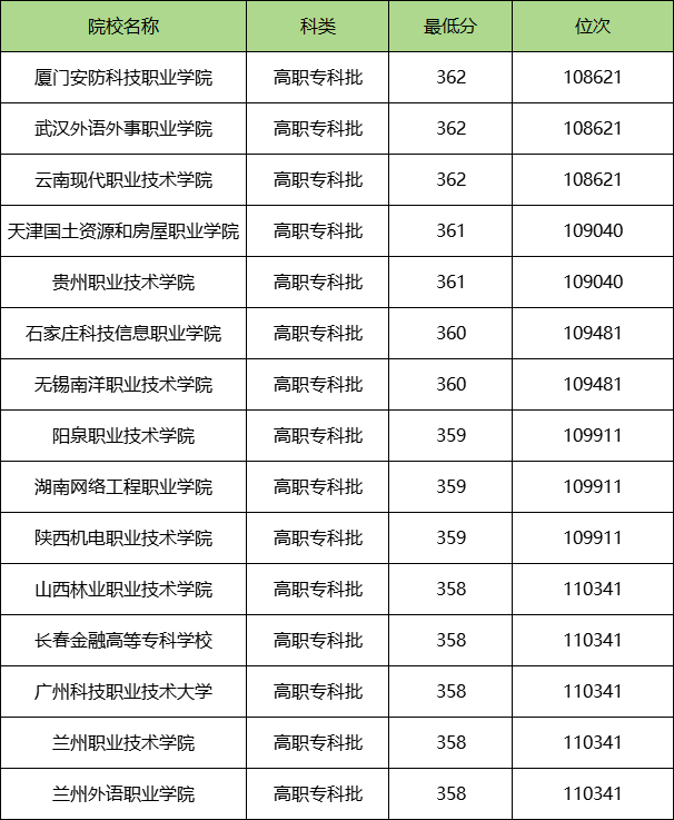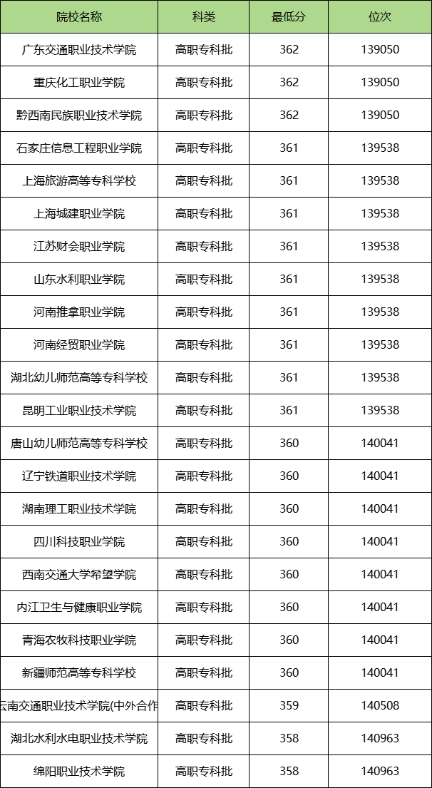 广东交通职业技术学院(362分)、上海城建职业学院(362分)、河南经贸职业学院(361分)。