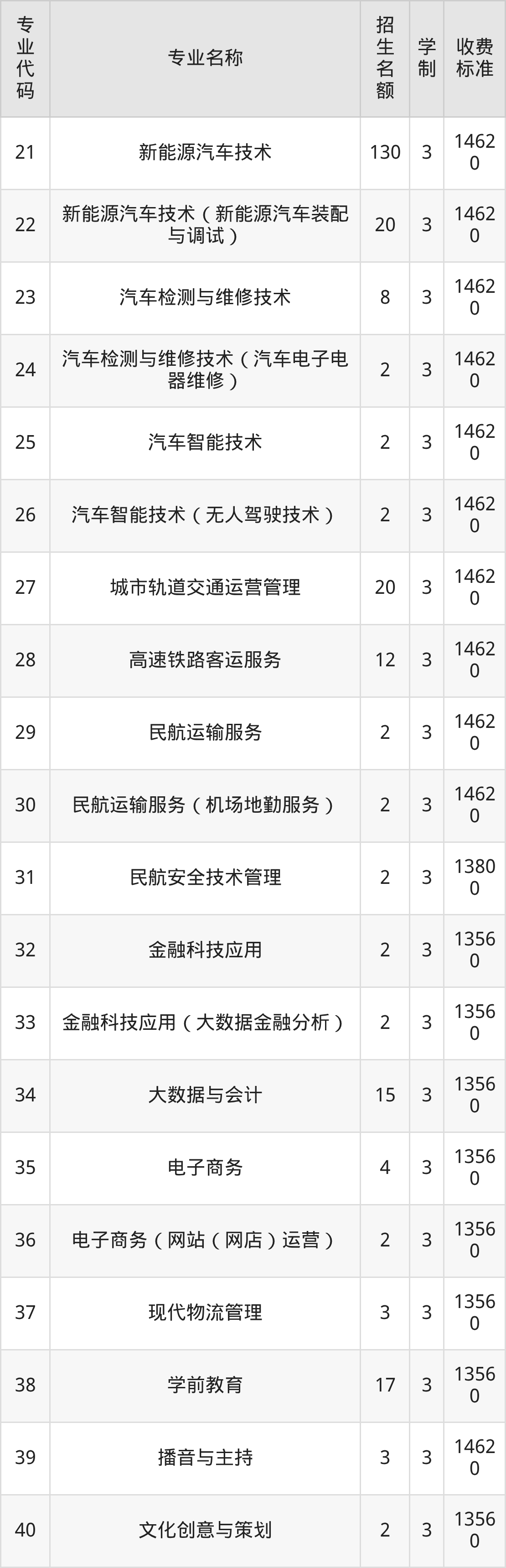 | 专业 代码 | 专业名称 | 招生 名额 | 学 制 | 收费 标准 |