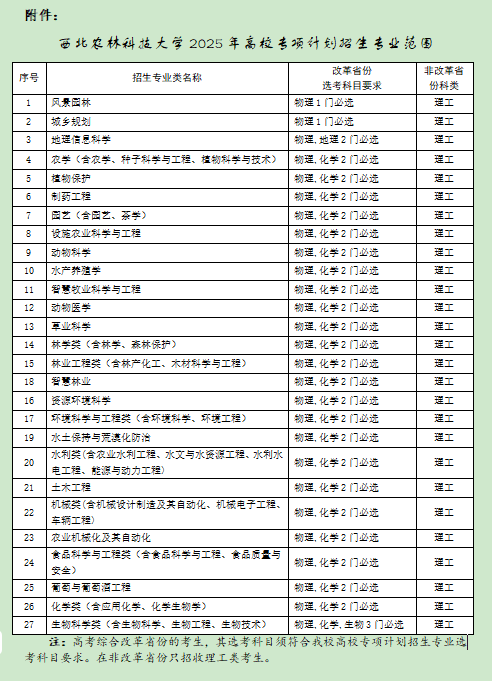 2025年西北农林科技大学高校专项计划招生专业覆盖农学、工学、理学三大领域,包括: