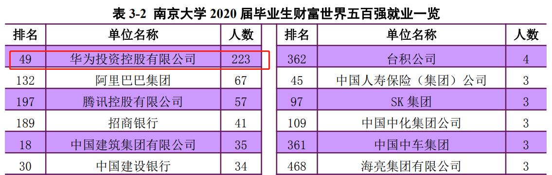 (17)东北大学:世界500强公司中,2019年华为招收东北大学的人数最多,但并未公布具体招收人数。