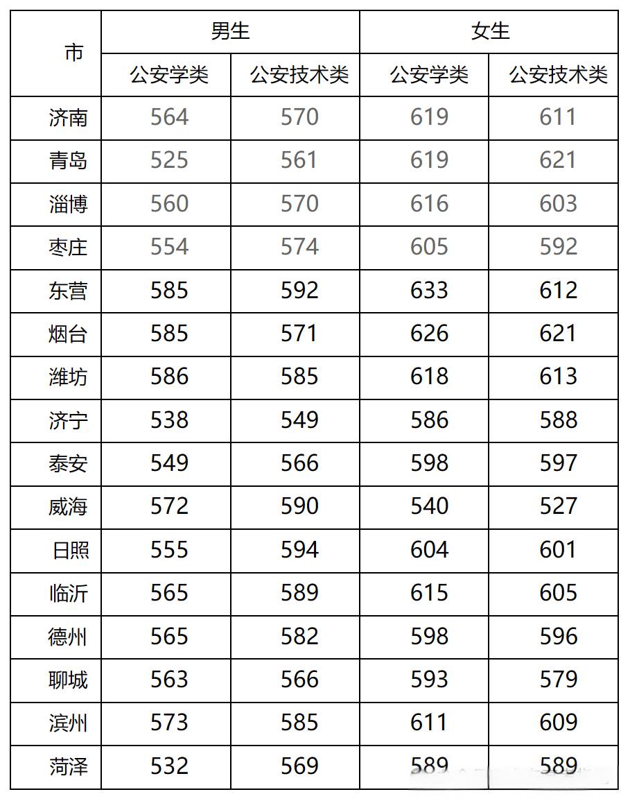 根据2025年山东警察学院在山东省的录取情况,统计男女生分数如下: