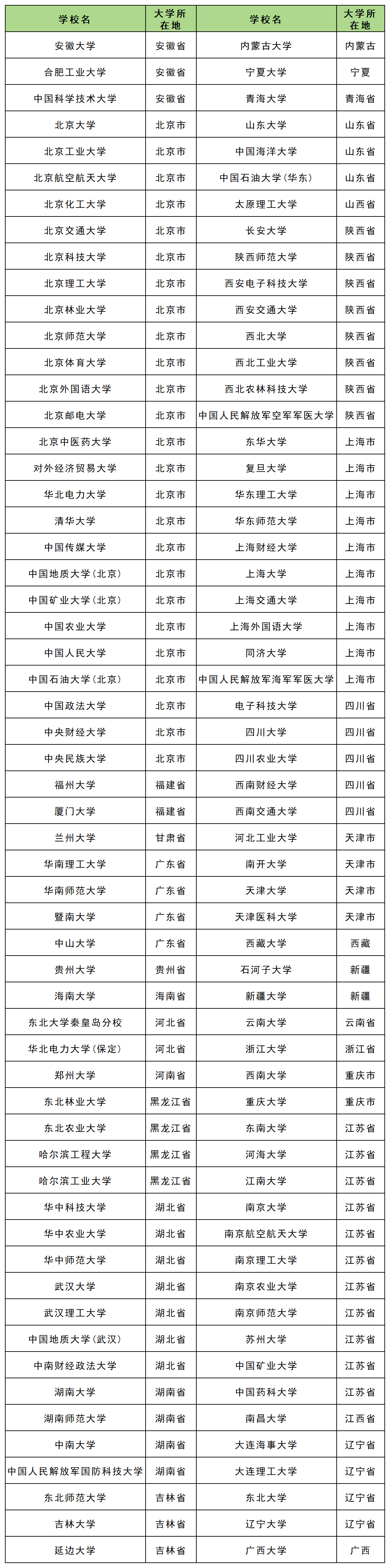 四川省:四川大学、电子科技大学、西南交通大学、西南财经大学、四川农业大学。