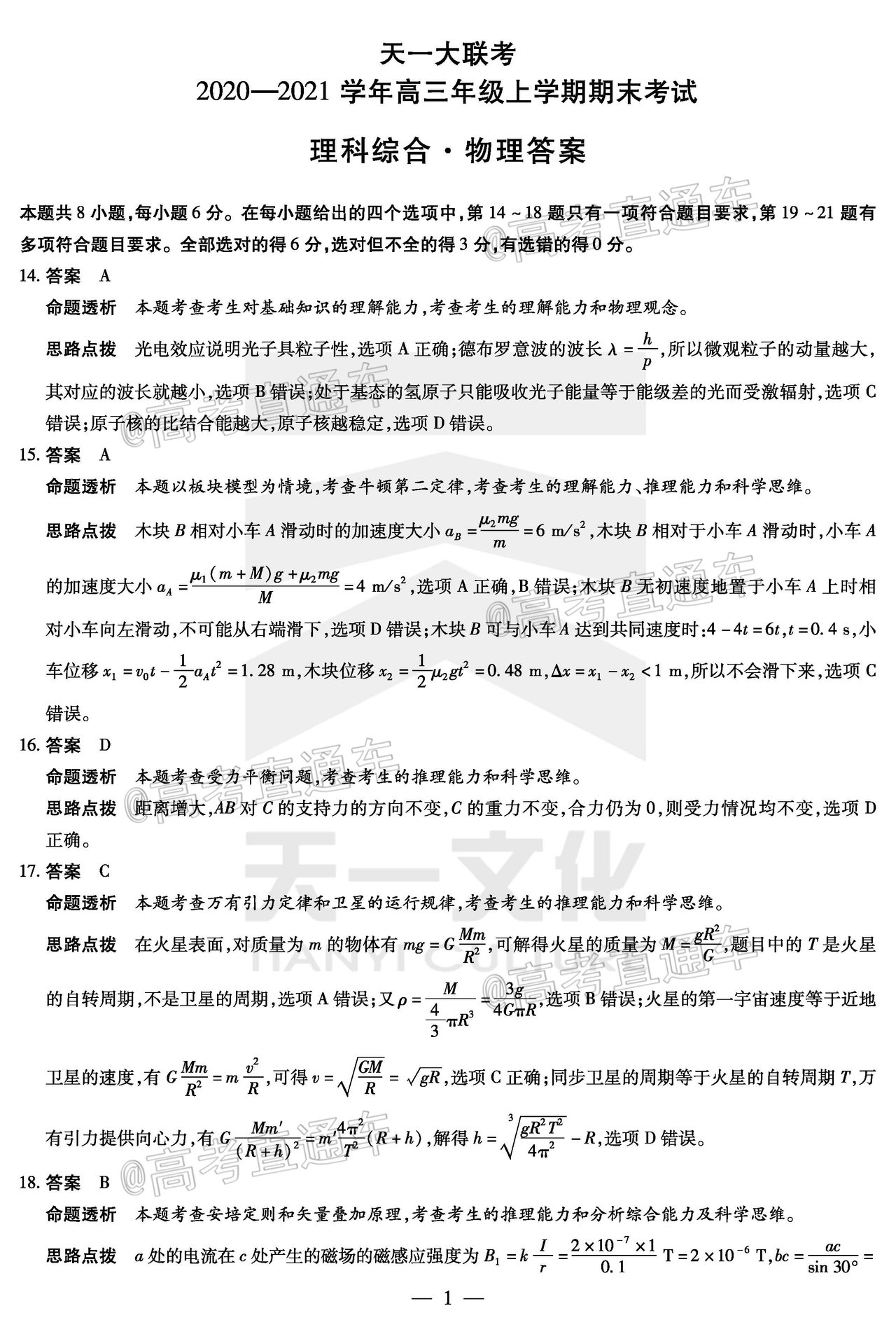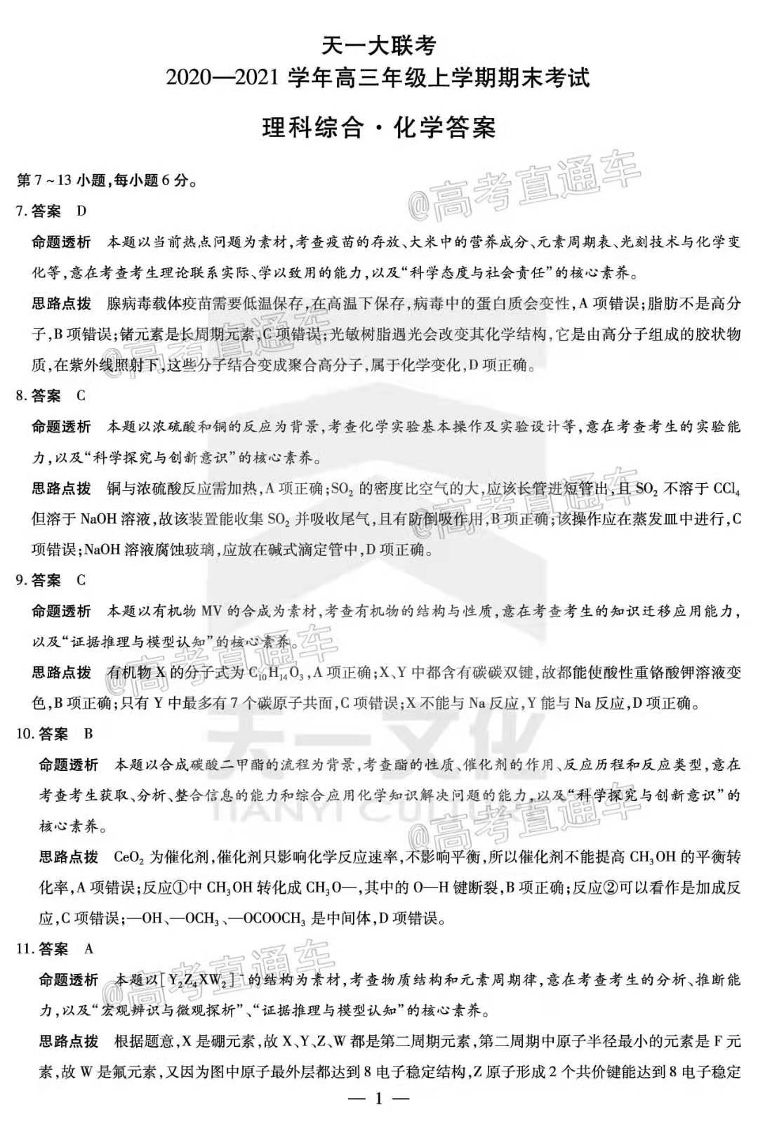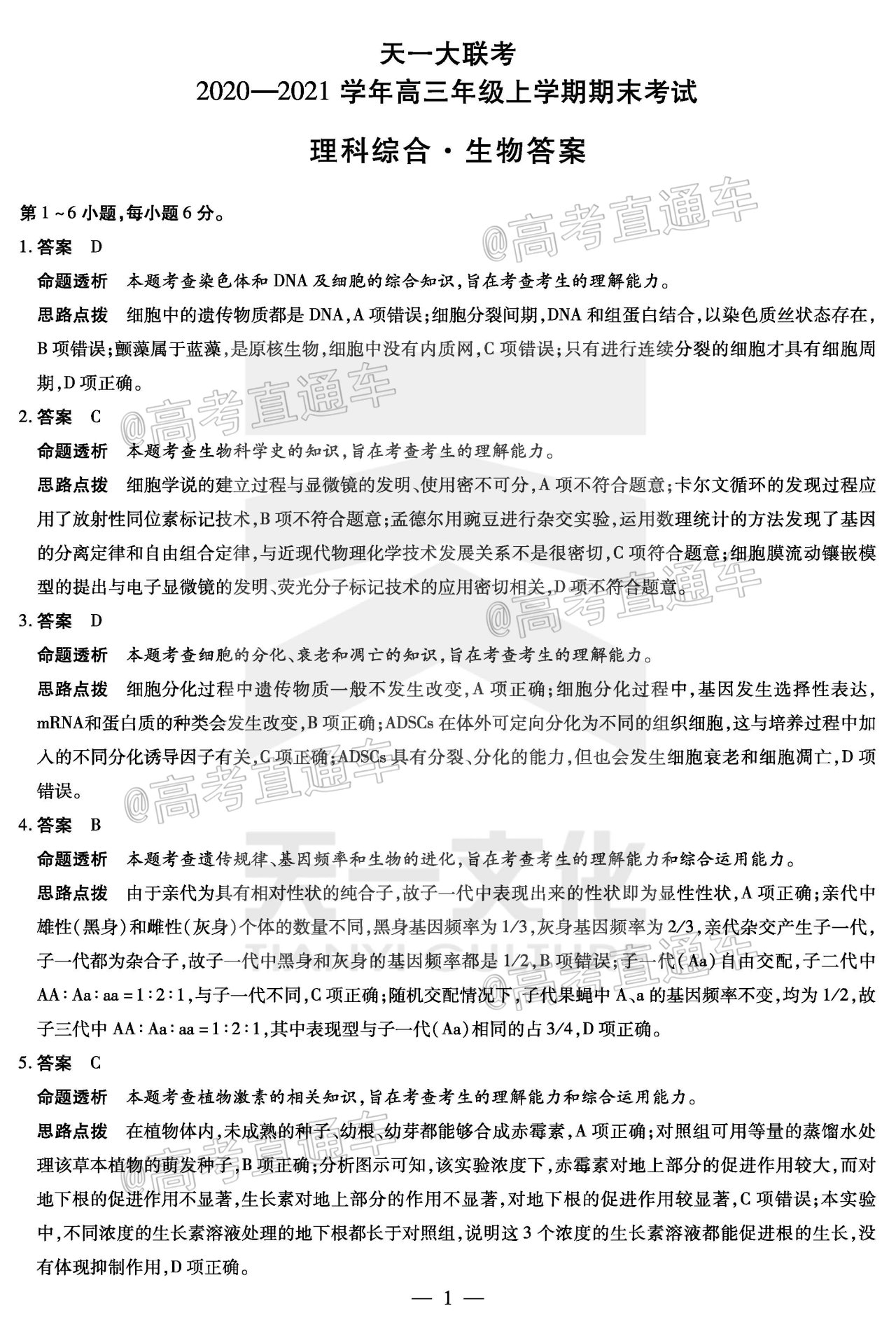 天一大联考理综试卷答案解析!天一大联考高三理综答案(2021年)