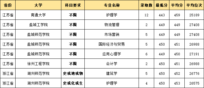 同时那些没选物理也可以报考的专业,分数线都是在450-460分以上才有机会进入上海本地的公办大学。如果分数不足450分,同时又想上公办大学,那只有去外地这一个选择了。整理一下旁边江苏和浙江两省,非限选物理的专业录取最低分,低于450分的有下面这些,选择其实也不多,而且也都是在440分以上: