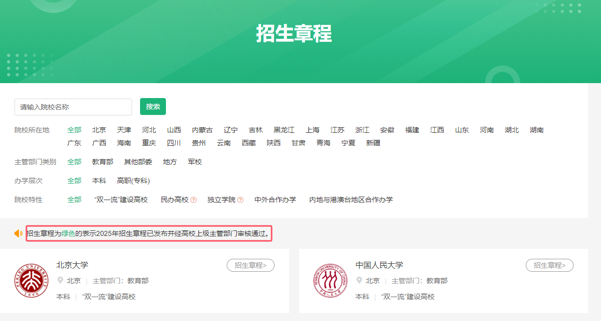 根据教育部发布的高校招生工作规定显示,2025年高考招生的学校必须将本校招生章程上传到教育部阳光高考信息发布平台,因此同学们可以在该平台上同时查看招生院校名单以及2025年招生章程。