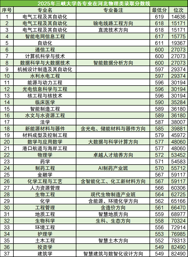 篇幅有限,下面为大家整理了三峡大学2025年排名及各专业在河北省物理类录取分数线,供各位考生参考。