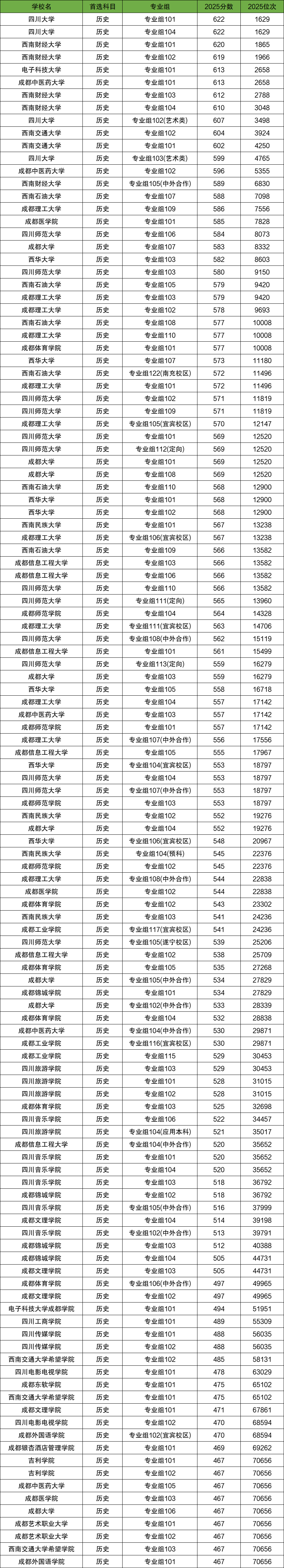 2025年成都本科各大学中,在历史类分数线最高、最难考的院校是四川大学(专业组101),2025年录取分数622分,录取位次1629位;