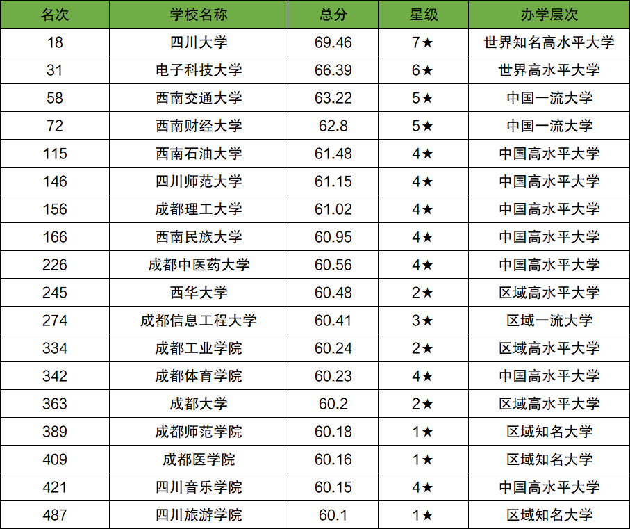 注:本文整理出的成都各大学排名均为成都公办本科院校的排名。