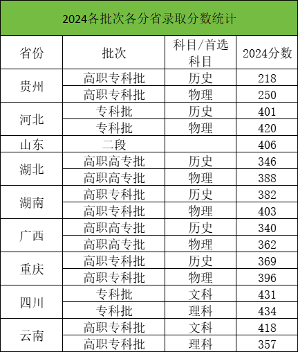 2024年贵州轻工职业技术学院专科批招生,各省最低录取分数线如下: