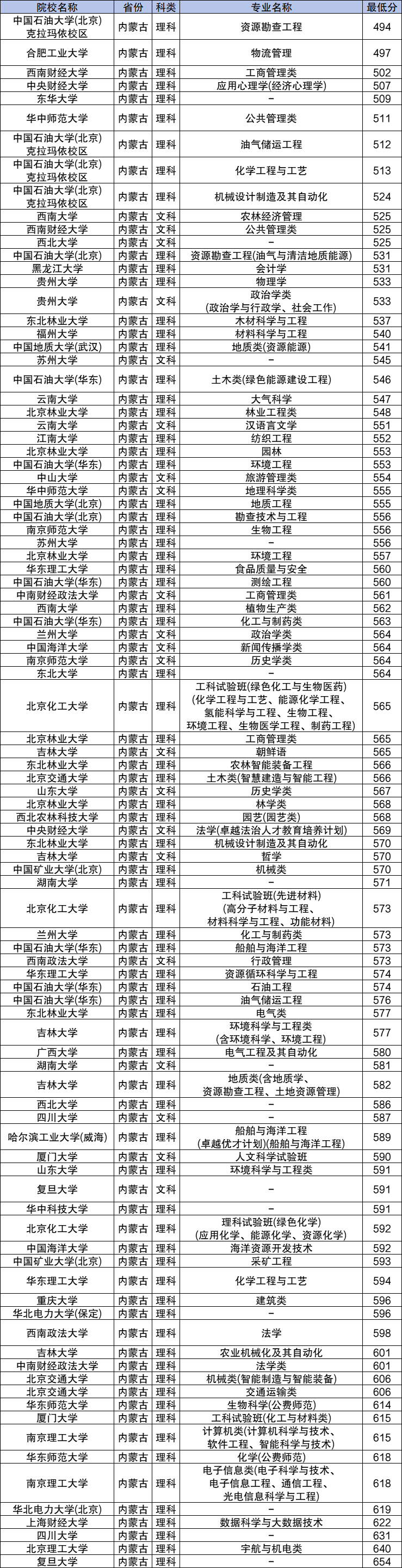 2024年内蒙古高校专项计划理科录取分数线494分到654分之间,分数线最低的是中国石油大学(北京)克拉玛依校区资源勘查工程专业、分数线最高的是复旦大学。
