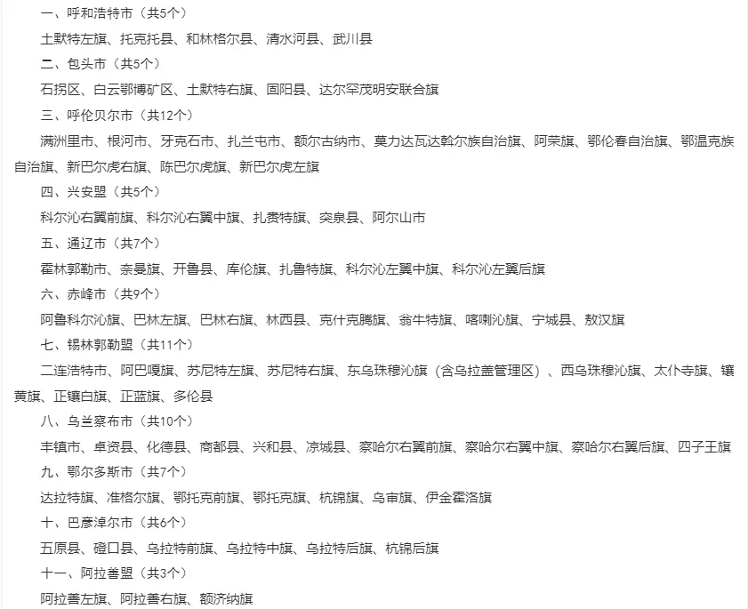 锡林郭勒盟:二连浩特市、阿巴嘎旗、苏尼特左旗、苏尼特右旗、东乌珠穆沁旗(含乌拉盖管理区)、西乌珠穆沁旗、太仆寺旗、镶黄旗、正镶白旗、正蓝旗、多伦县
