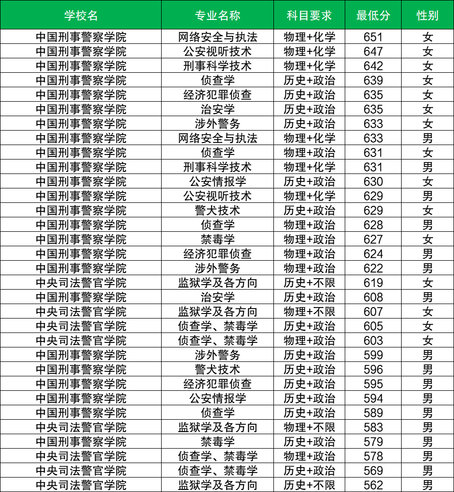 历史类:最低分 562分,对应专业为 监狱学及各方向,招生性别为 男。