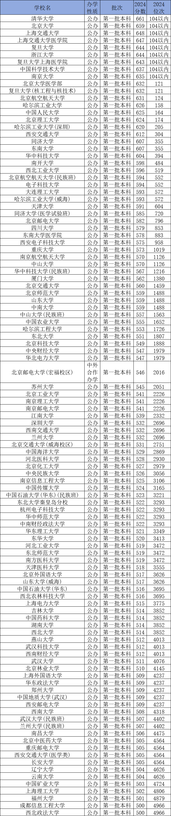 1-5000名范围内,最高位次院校为清华大学,2024年录取位次是104名以内,录取分数线是661分;