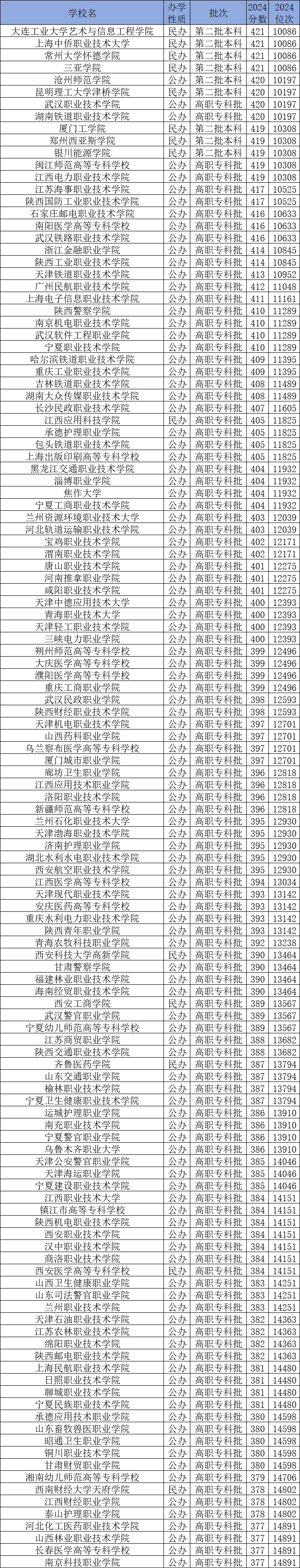 1万-1.5万名范围内,最高位次院校为大连工业大学艺术与信息工程学院、上海中侨职业技术大学、常州大学怀德学院等,2024年录取位次是10086名,录取分数线是421分;