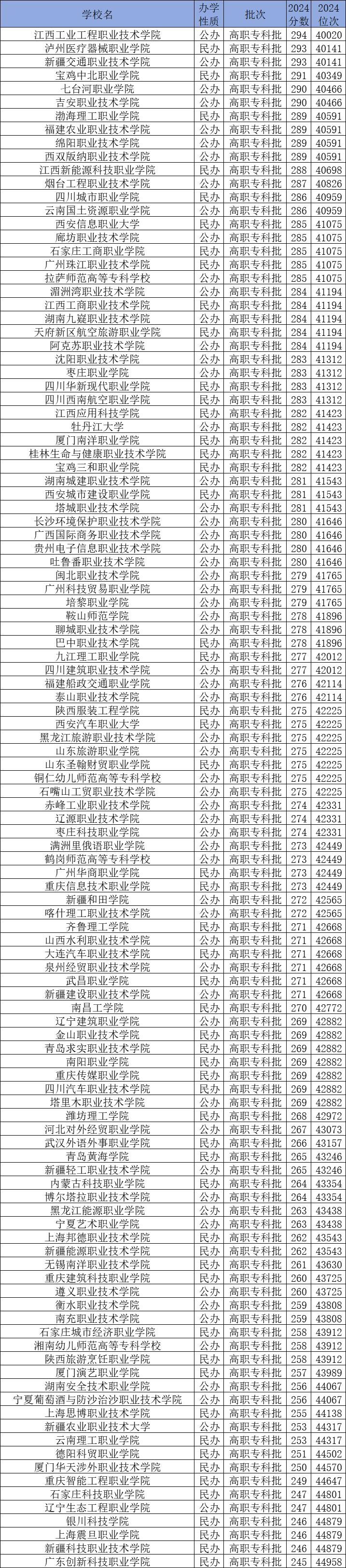 4万-4.5万名范围内,最高位次院校为江西工业工程职业技术学院,2024年录取位次是40020名,录取分数线是294分;