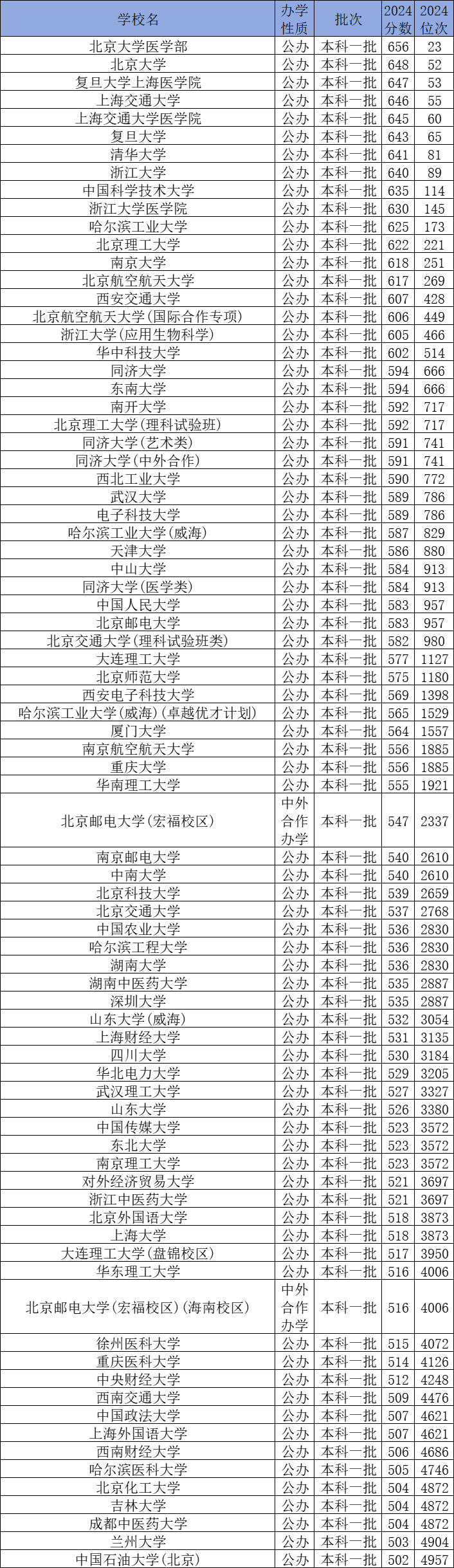 最低位次院校为中国石油大学(北京),2024年录取位次是4957名,录取分数线是502分。