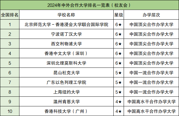 在2024年校友会发布的中外合作大学排名中,排名前十的中外合作大学分别是北京师范大学-香港浸会大学联合国际学院、宁波诺丁汉大学、西交利物浦大学、香港中文大学(深圳)、深圳北理莫斯科大学、昆山杜克大学、广东以色列理工学院、上海纽约大学、温州肯恩大学、香港科技大学(广州)。