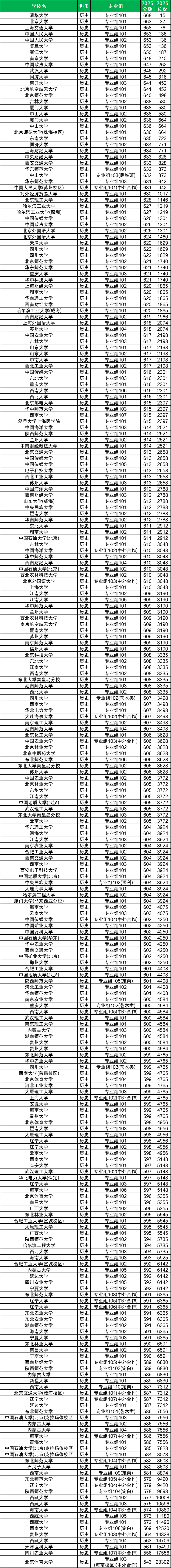2025年211大学招收历史类考生的分数线范围在543分-668分之间,最低分院校是北京体育大学,其103组(海南校区)(中外合作)录取历史类考生的最低位次为23302名。而录取分数最高的是清华大学101组(668分),其最低录取位次为15名,比物理类的位次门槛还要高。