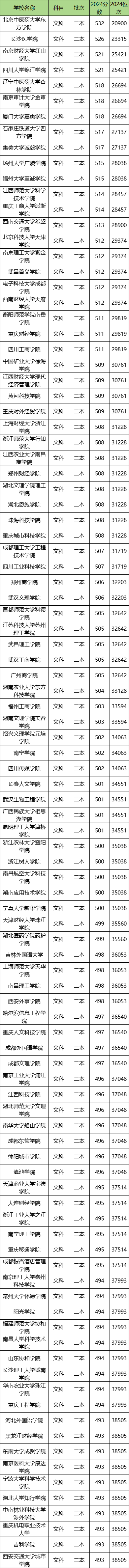 篇幅有限,下面仅整理了民办二本大学2024年在云南文科的录取分数线TOP100一览表,如下: