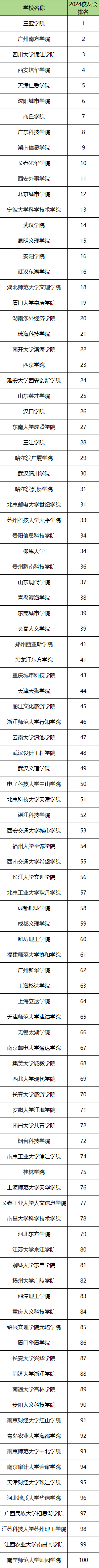 以下是2024年民办二本大学100强排名表: