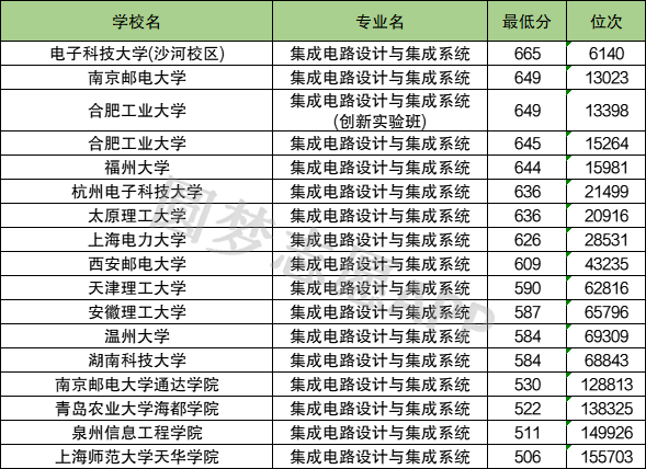 下表为集成电路设计与集成系统专业中分数线排名靠前的大学名单及分数。