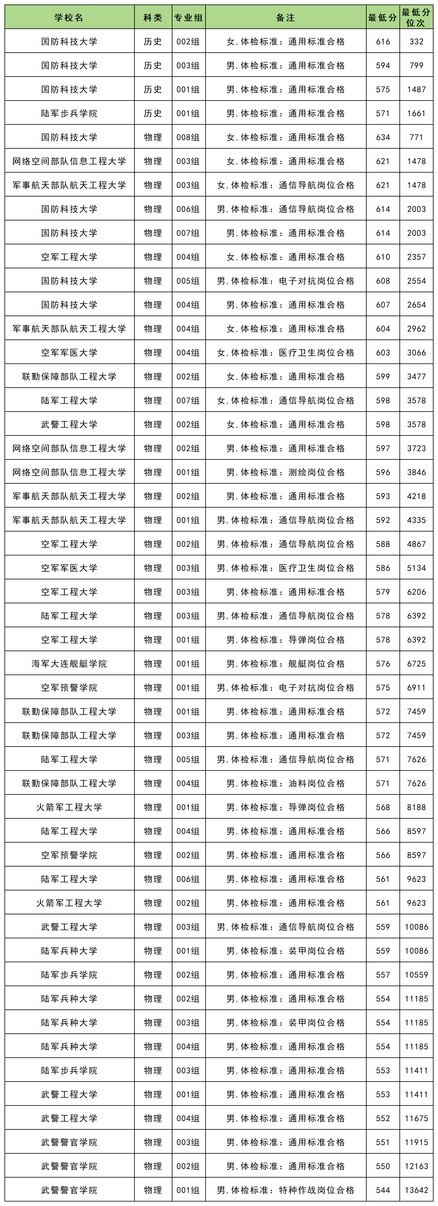 女生最低录取分数线为616分,对应最好考的学校是国防科技大学(002组)。