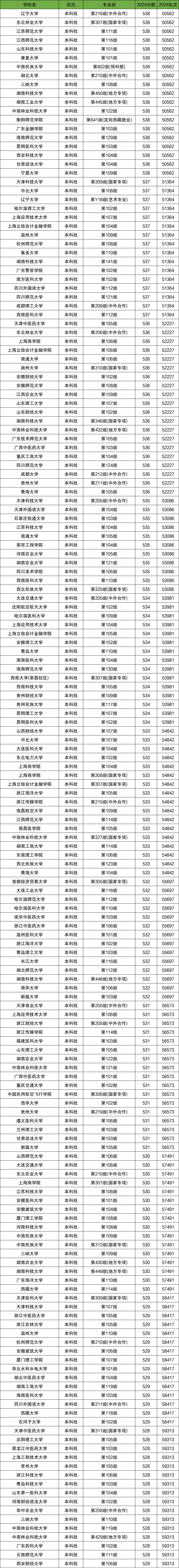 2024年全国大学在湖南物理中录取位次为5-6万的大学有176个院校专业组,对应分数区间为538-528分。