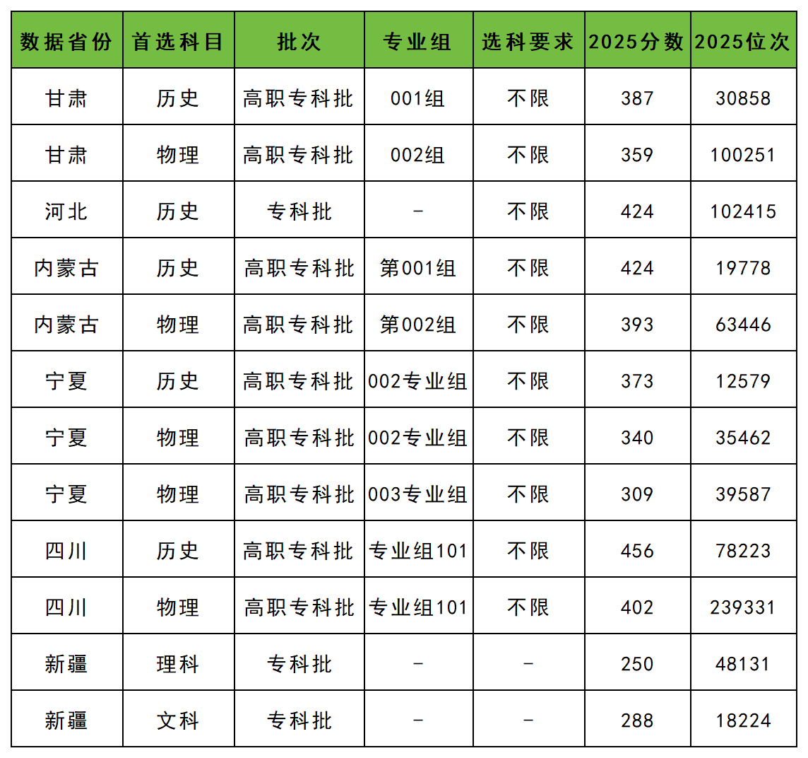 宁夏警官职业学院2025在各省普通批招生最低分数线汇总如下: