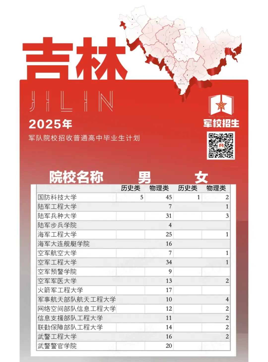 2025年全国17所军校在吉林招生计划总人数320人,其中男生296人、女生24人。下面是各个军校招生人数情况汇总: