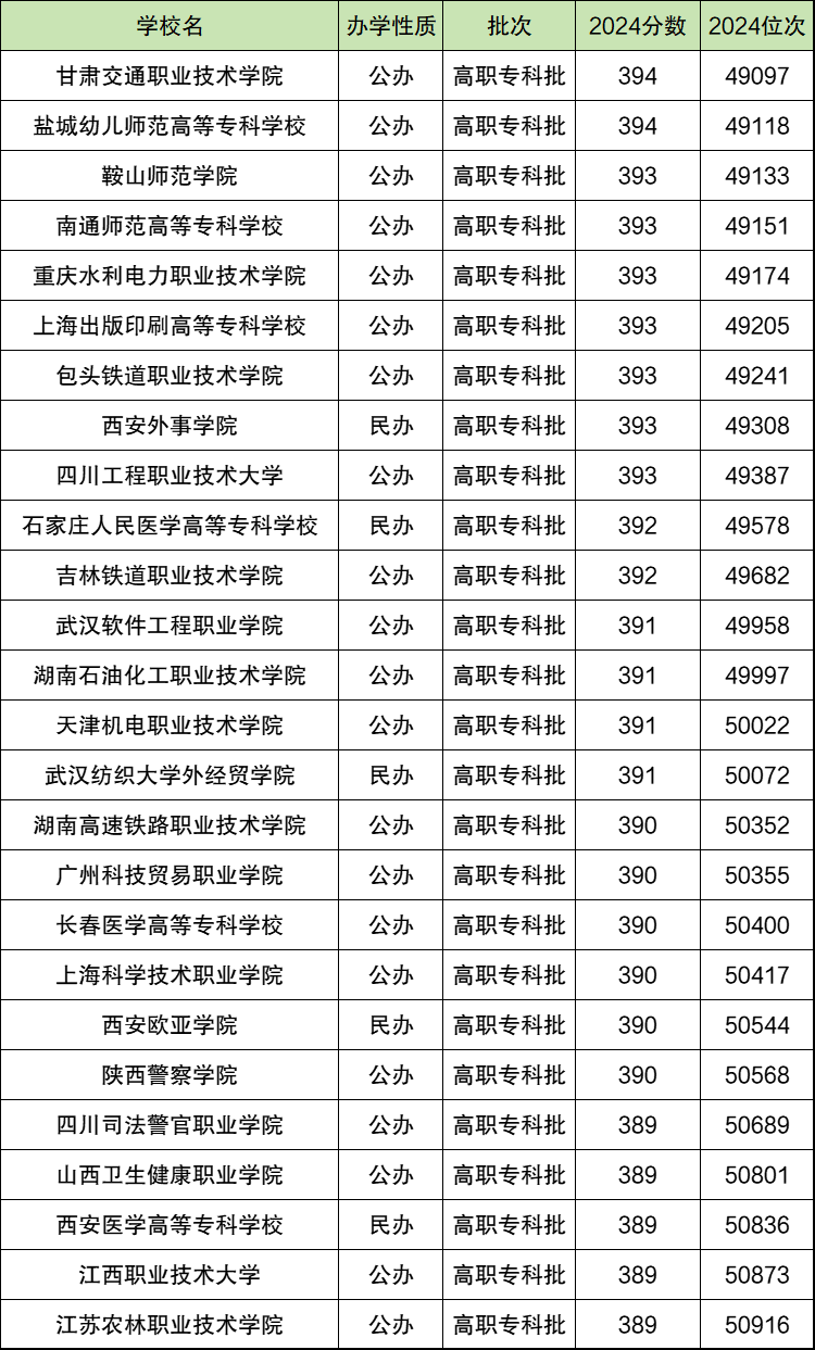 位次5万名左右的考生能上的学校有:吉林铁道职业技术学院(49682名)、武汉软件工程职业学院(49958名)、湖南石油化工职业技术学院(49997名)、天津机电职业技术学院(50022名)、武汉纺织大学外经贸学院(50072名)、湖南高速铁路职业技术学院(50352名)等。