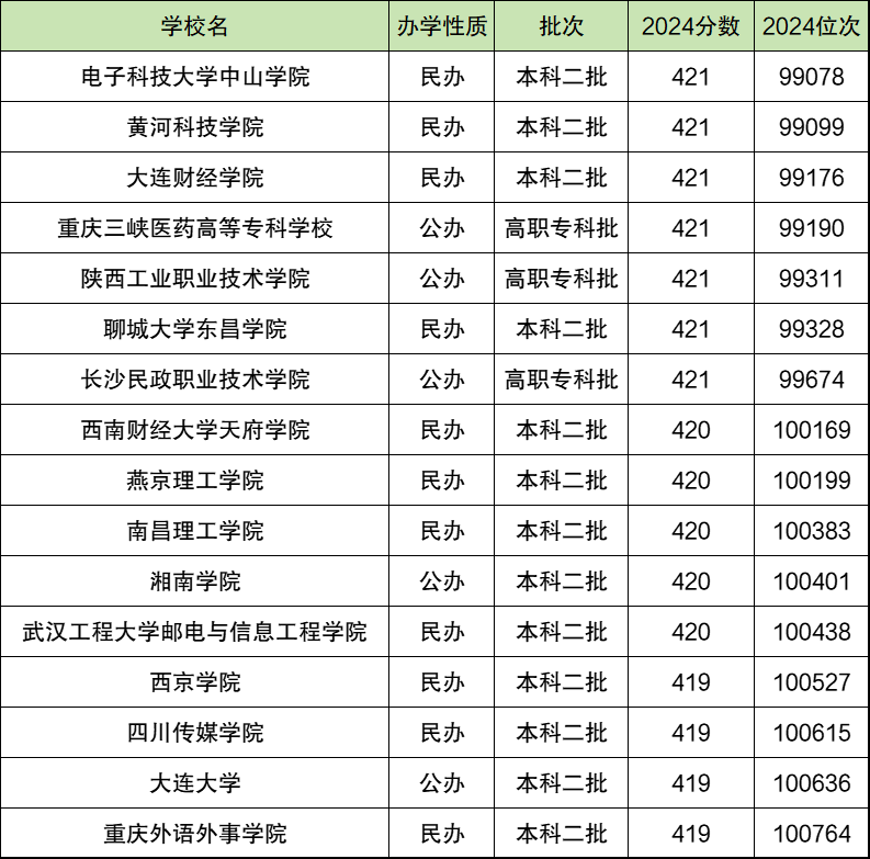 陕西理科成绩排名10万能上的大学具体位次为:99078名-100764名,共有16所,对应421分数为分-419分。