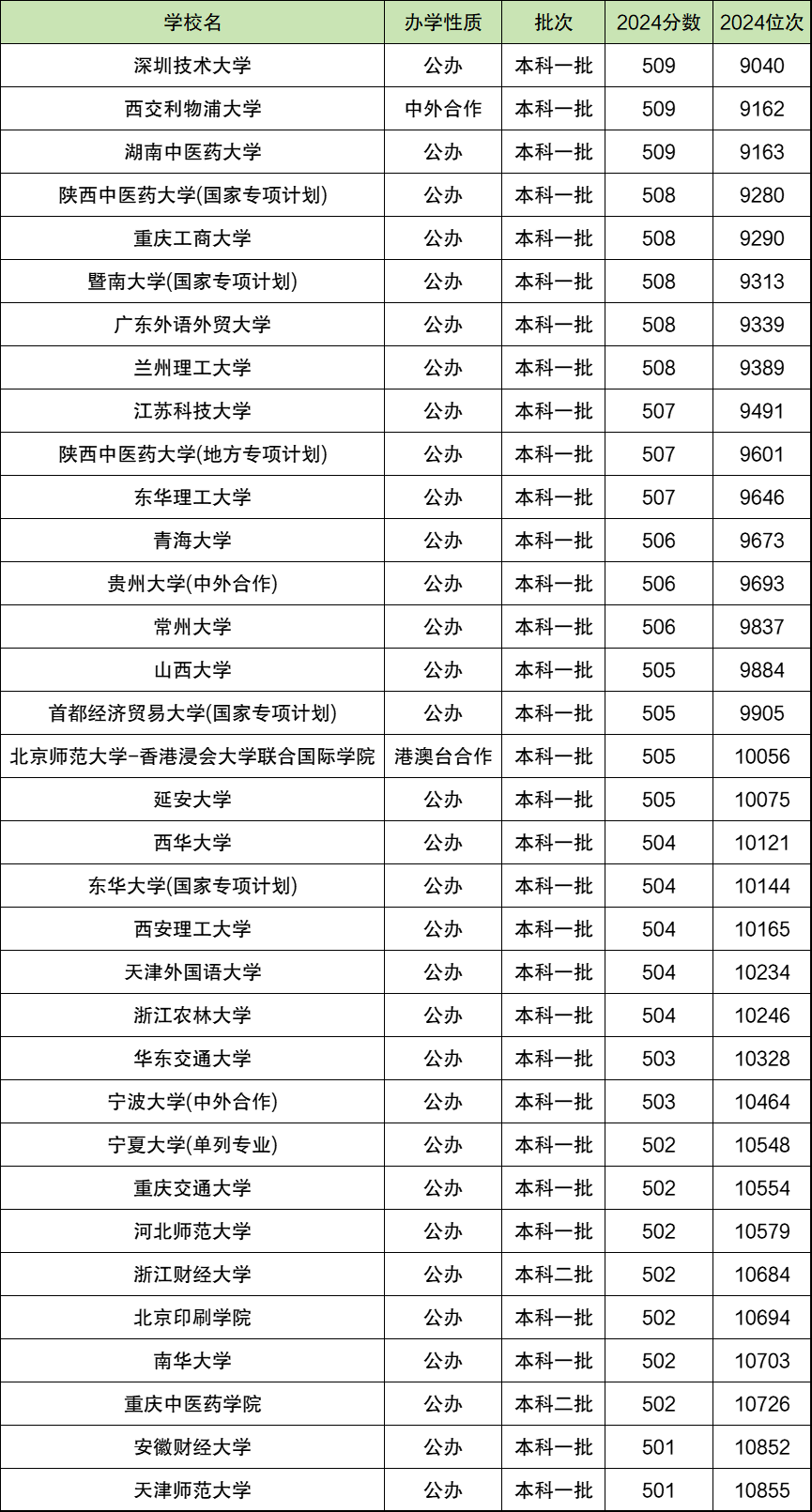 陕西文科成绩排名1万能上的大学具体位次为:9040名-10855名,共有34所,对应分数为509分-501分。